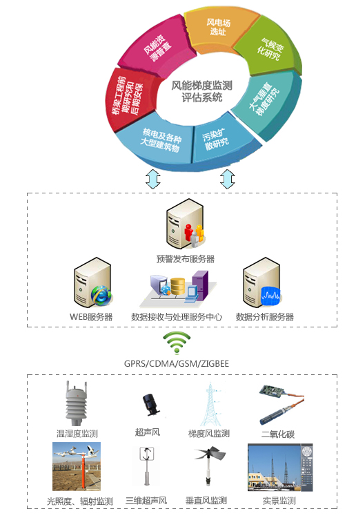 風(fēng)能梯度監(jiān)測評估系統(tǒng)是協(xié)助用戶建立風(fēng)能(風(fēng)力)專業(yè)觀測網(wǎng);開展長期連續(xù)穩(wěn)定的氣象觀測,獲取風(fēng)能(風(fēng)力)信息,滿足風(fēng)能資源數(shù)值模擬、風(fēng)況特征分析、風(fēng)工程參數(shù)分析和近地層氣象要素梯度變化。是針對各要素垂直空間分布測量而設(shè)計的高精度氣象監(jiān)測設(shè)備,它能對大氣平均特征和湍流特征進行直接測量,實現(xiàn)對不同下墊面的邊界層能量、輻射、多種物質(zhì)交換、阻尼和擾動的觀測和研究。每層可測量風(fēng)向、風(fēng)速、溫度及氣壓等常規(guī)氣象要素場,也可測量三維湍流、二氧化碳和水汽通量及太陽輻射。具體傳感器的配置可視用戶需要進行合理配置。